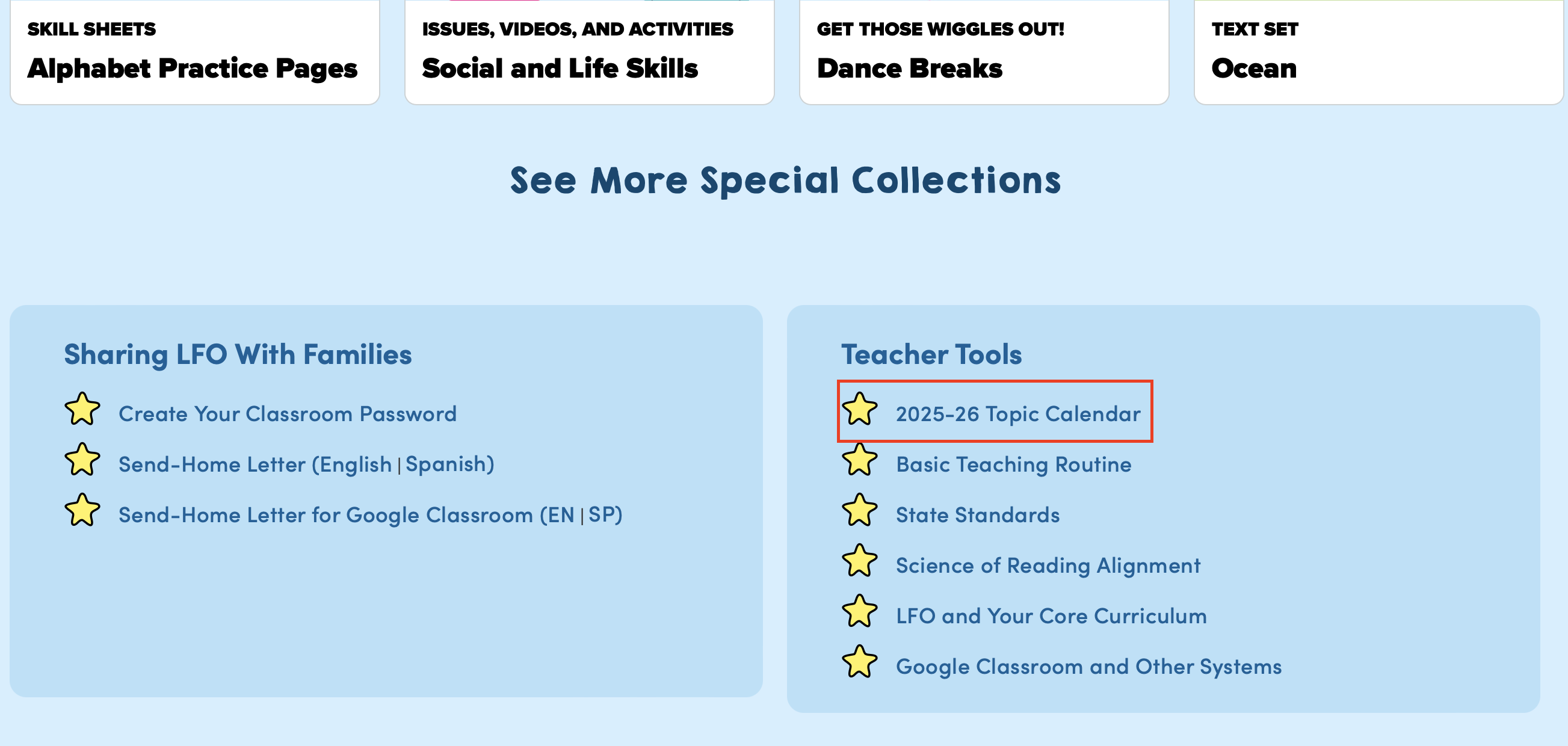 Click “Topic Calendar” under the Teacher Tools list on our homepage. It will bring you to a colorful Google Slides document listing the year’s topics for My Big World issues and posters.